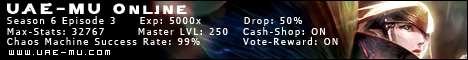 UAE-MU ONLINE S6 EP3 EXP:5000x|DROP:50%|EXEDROP:90%|VOTEREWARD|GRANDRESET|CREDIT.PER.RESET|CASTLE SIEGE|ALL EVENTS|3D CAMERA|JEWELS IN SHOP|CASHSHOP & WEBSHOP WITH CREDITS|MULTI SPAWNED SPOTS|MU HELPER|SOCKET SYSTEM|MASTER LEVEL 100%|10 EXTRA VAULTS|4
